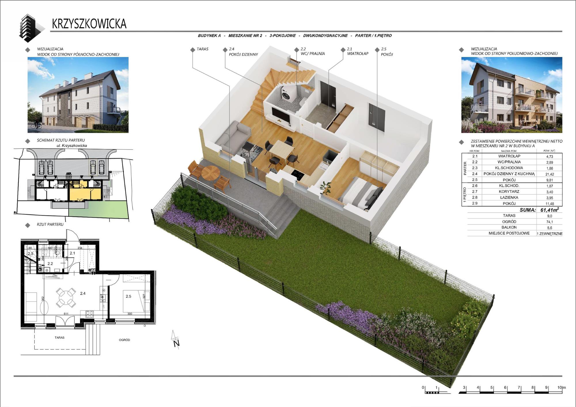 Na sprzedaż funkcjonalne, dwupoziomowe mieszkanie 3-pokojowe o powierzchni 61,41 m², zlokalizowane w kameralnym budynku mieszkalnym. Nieruchomość wyróżnia się czytelnym podziałem funkcjonalnym, prywatnym ogrodem oraz dodatkowymi przestrzeniami zewnętrznymi.
