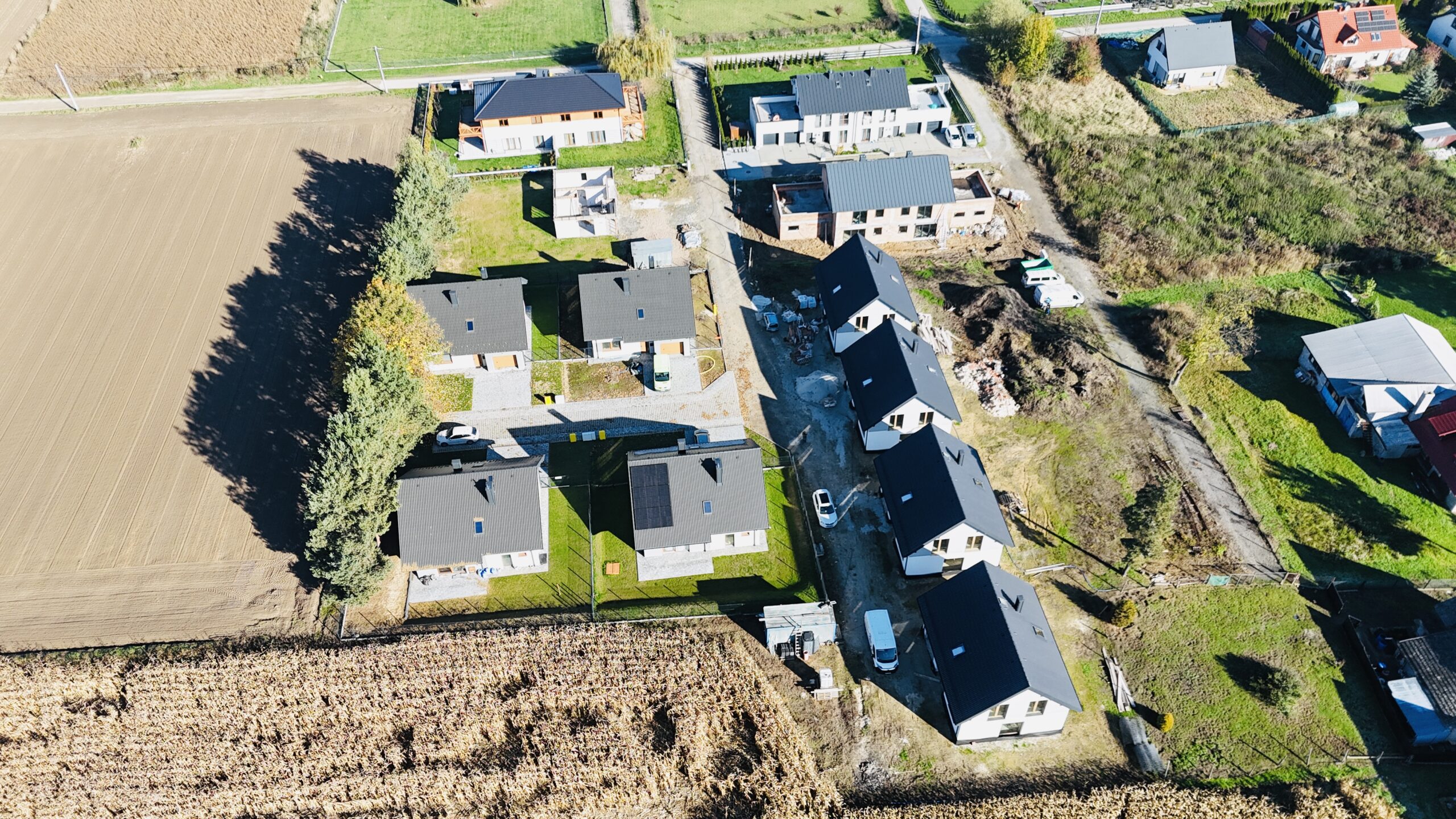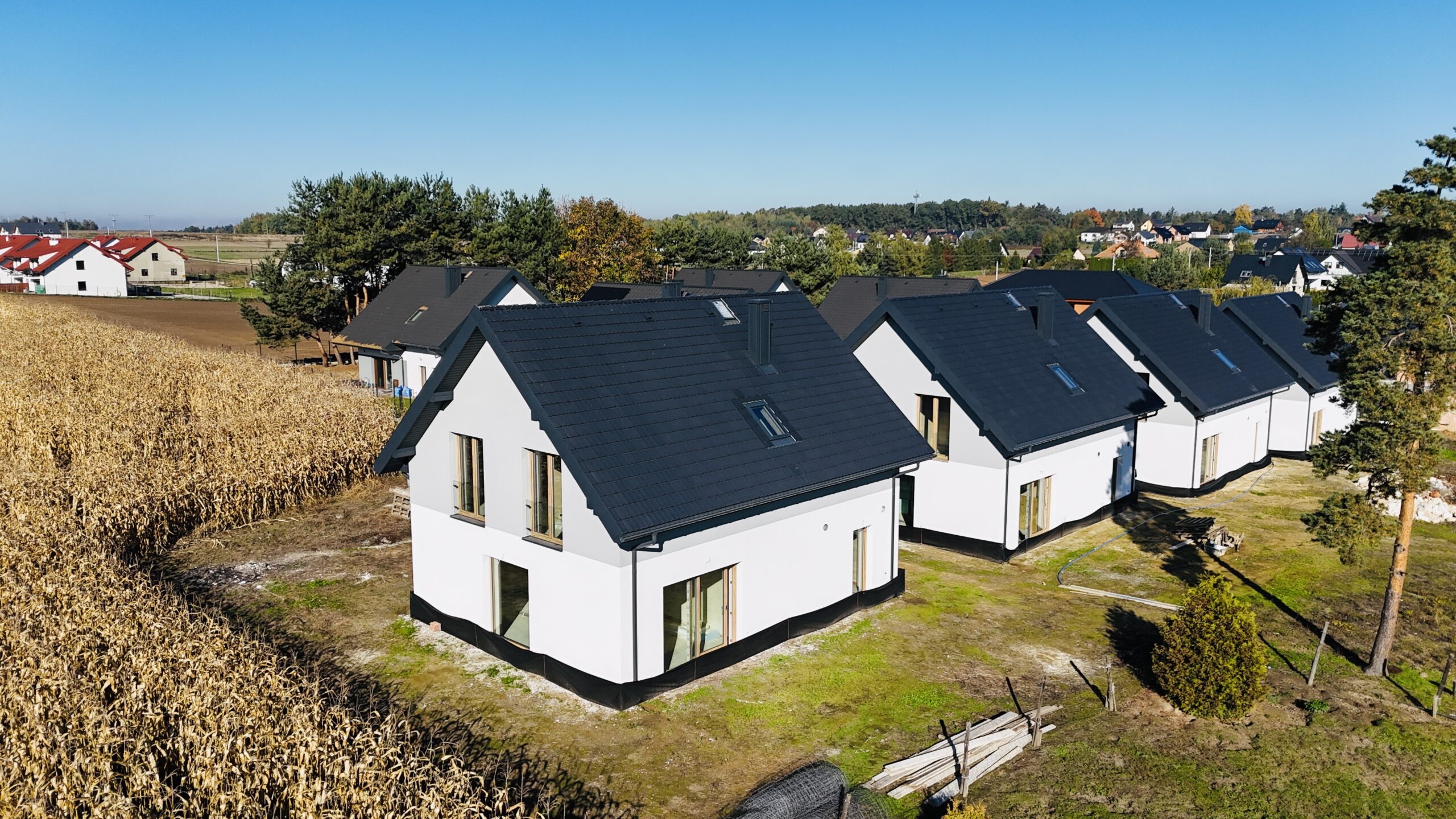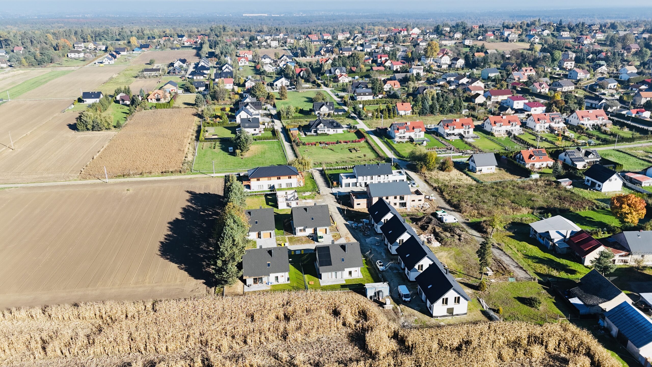 Każdy dom posadowiony jest na działce ok. 300 m² – idealnej wielkości, by cieszyć się ogrodem bez konieczności czasochłonnej pielęgnacji. Otoczenie inwestycji to niska zabudowa jednorodzinna, pola i tereny zielone, które gwarantują prywatność i poczucie przestrzeni.